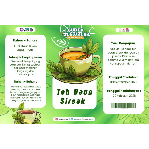 Teh Daun Sirsak adalah minuman herbal alami yang terbuat dari daun sirsak kering pilihan, diproses secara higienis untuk mempertahankan khasiat dan cita rasa alaminya. Kaya akan antioksidan, vitamin, dan senyawa bioaktif seperti acetogenin, teh ini menawarkan manfaat kesehatan luar biasa dengan aroma lembut dan rasa yang menyegarkan.