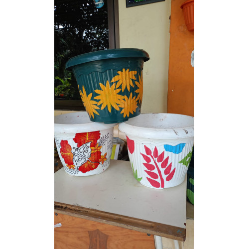 pot hias merupakan pot plastik dengan diameter 50 cm , dihias dengan ornamen flora .
