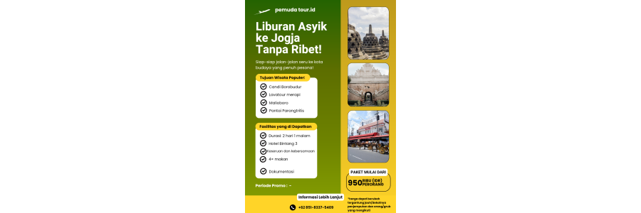 Jangan lewatkan liburan seru yang penuh kenangan ke Jogja. Yuk daftar sekarang dan rasakan keseruannya bersama pemuda tour.id!